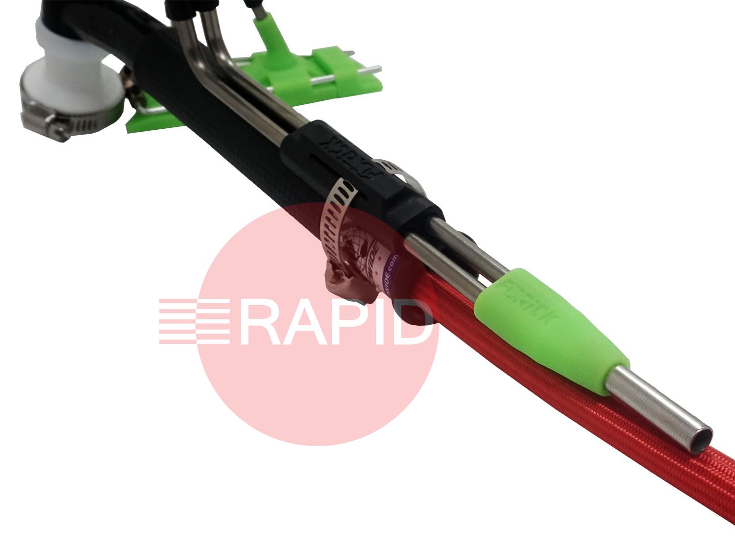 • Taper the system down to your workpiece. It is not going to shoot gas like your cup does in a straight spray.  At the cup side it should be about even with the end of the cup, then angle the system as it gets away from the cup down to your workpiece