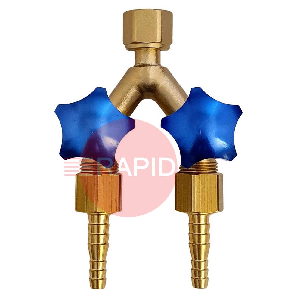 Double outlet Oxygen for two gas outlets from a regulator. Provided with hose sockets for hose with 5.0 and 6.3 mm internal diameter.