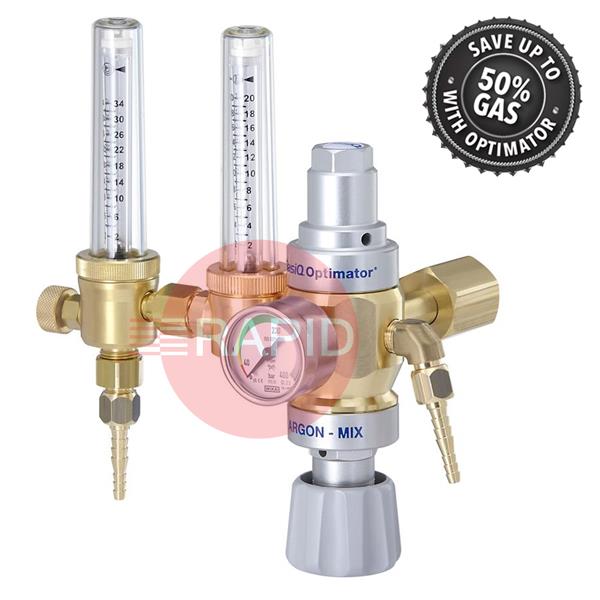 GasiQ Optimator II Argon/Mix Gas Saver Regulator. 20/34Lpm. W21.8 x 1/14" Cylinder Connection. G1/4" Outlers.