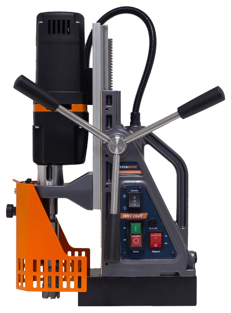 The HMT VersaDrive V60T is a portable magnetic drill machine designed to meet high performance and low maintenance to deliver continuous performance in the harshest of drilling and fabrication environments. Being the first UK-made portable drilling machine, the V60T combines lightweight and portability with a high-power all-day broaching capability of up to 60mm in diameter with forward reverse and a variable speed motor that can tap holes up to M20 in diameter. This machine is highly rated for reaming, countersinking, and tapping applications with advanced electromagnets (also made in the UK). These electromagnets can provide a superior magnet hold for better safety and stability.