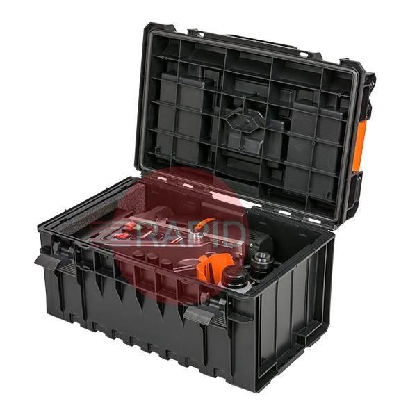 Supplied with STAKIT Base case, VersaDrive Rapid-Lock adaptor, morse taper broaching arbor, handles, restraint strap, heavy-duty metal guard & coolant-fed arbor.