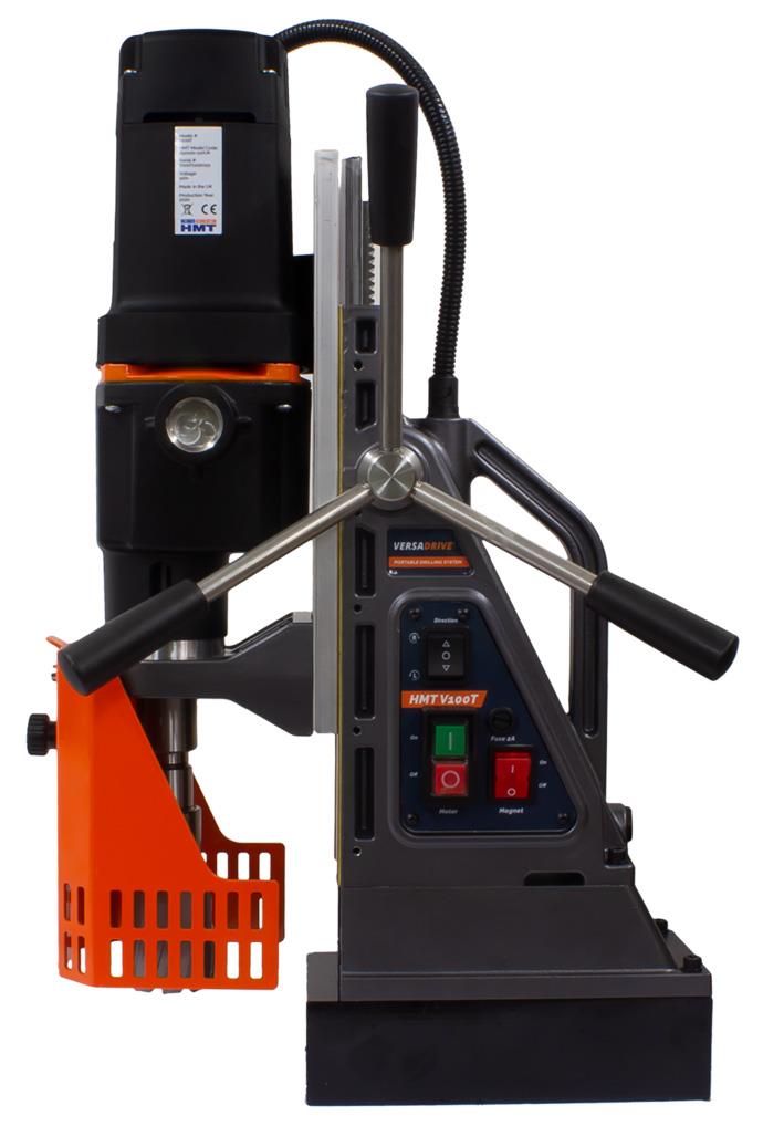 The HMT VersaDrive V100T is a portable magnetic drill machine designed to meet high performance and low maintenance to deliver continuous performance in the harshest of drilling and fabrication environments. Being the first UK-made portable drilling machine, the V100T combines lightweight and portability with a high-power all-day broaching capability of up to 100mm in diameter with forward reverse and a variable speed motor that can tap holes up to M30 in diameter. The user can also achieve a broaching level up to 100mm in diameter with the assistance of the VersaDrive blind hole tapping system. This machine is highly rated for reaming, countersinking, and tapping applications with advanced electromagnets (also made in the UK). These electromagnets can provide a superior magnet hold for better safety and stability.