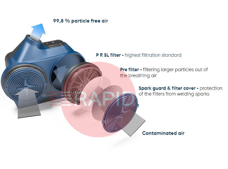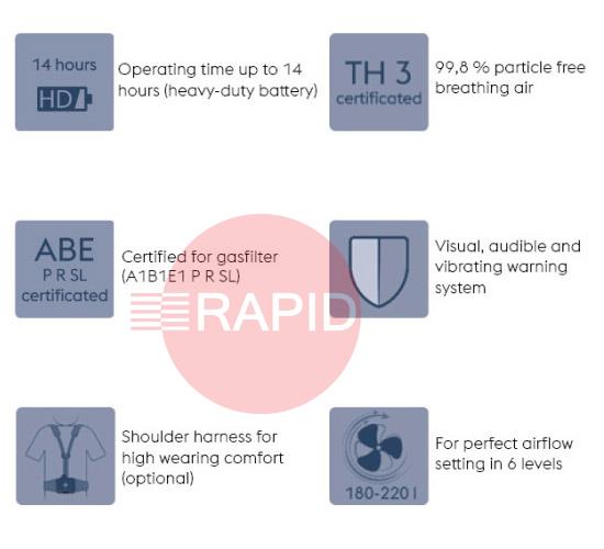 - Advanced PAPR System with Intelligent AirflowMaintain clean, cool, and filtered air throughout your work. The PAPR unit delivers constant airflow (180–240 l/min, 6 levels adjustable) and high-level filtration (TH3 rated) to protect against hazardous fumes and particulates.