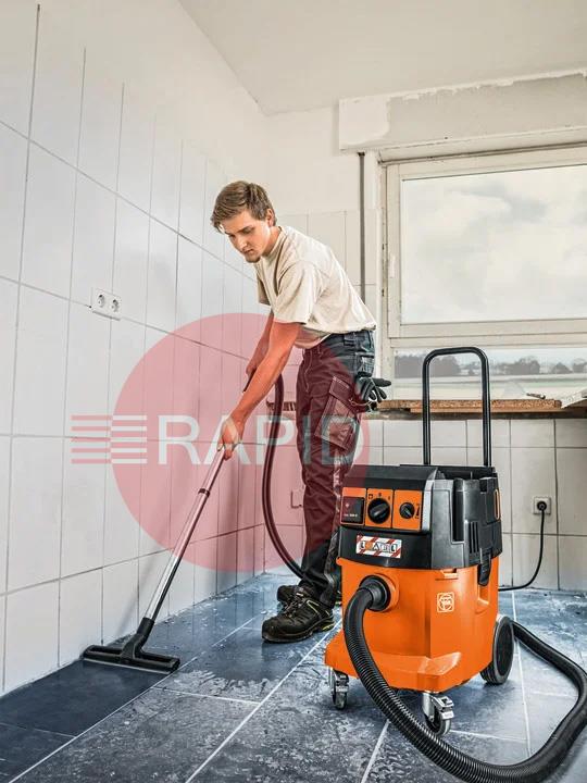 1 push bar, 1 PES flat fold filter, 1 disposal bag, 1x 4 m ES suction hose, diameter 35 mm, 1 tool collar with suction force regulation, 1 stepped collar, 2 suction pipes (metal), 1 combi nozzle with interchangeable inserts, 1 crevice nozzle, 1 suction brush, 1 elbow.