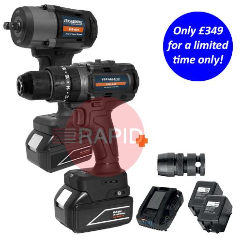 Also included are 2 x 4Ah batteries, compact charger, protective site cases and a VersaDrive Rapid-Lock Impact Wrench Adaptor.
