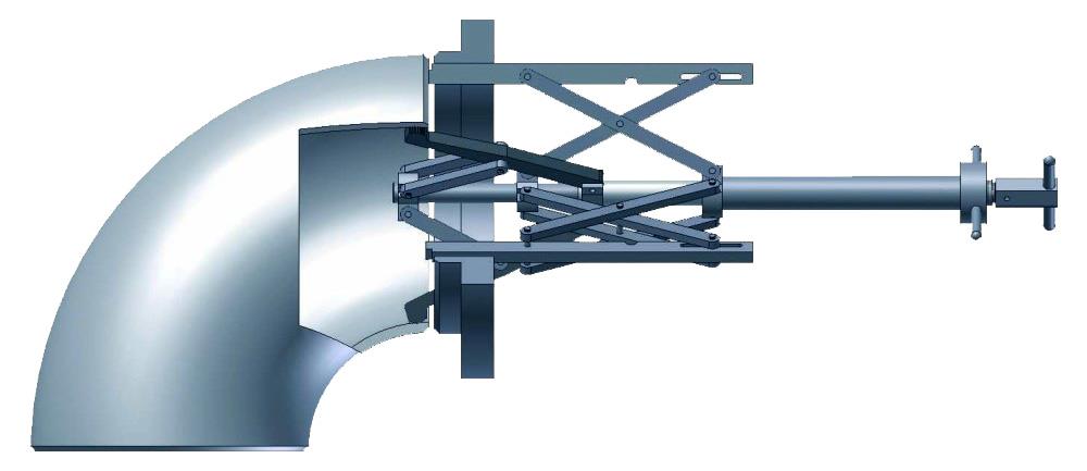 This model with two independent clamps is used for clamping flanges of all kinds and similar parts to elbows and pipe-bends of various diameters. The lower expanding clamp has strong gripping feet which insert into the bend and are tightened using the knob. The top expanding clamp is tightened using the handlebar in the flange.