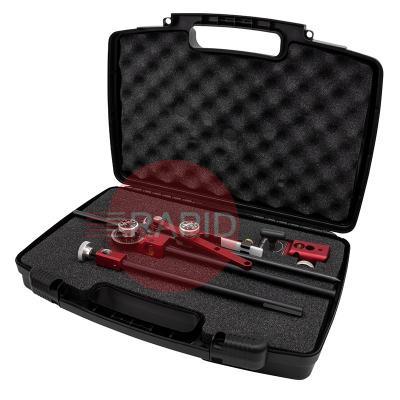 • A protractor, with adjustable shaft and sliding marking arm, fits in the main arm of the Imager allowing for layout of elliptical holes in header pipe for matching compound pipe laterals coming into the header.