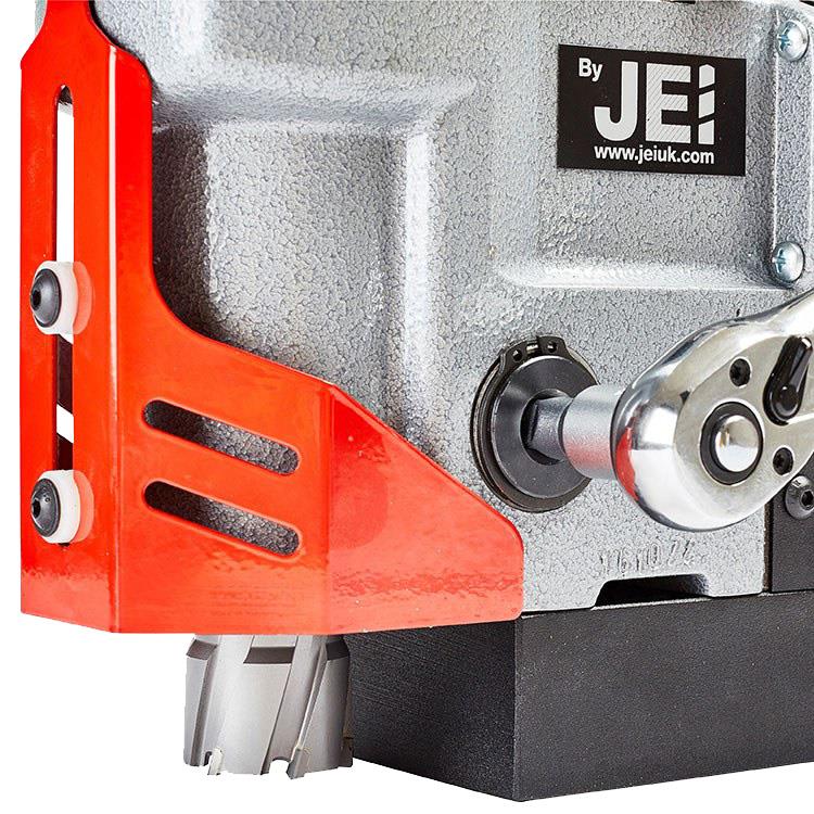 Compactness and lightweight at only 9.5Kg (this mag drill is perfect for space-restricted areas).  Ultra-low fixed working height at only 176mm.  Maximum drilling diameter of 35mm with annular cutters and tungsten carbide models.  Positive quill drive for close tolerance holes.  Able to drill with twist drills with 19.05mm (3/4”) Weldon shanks.  Integrated safety guard.  Detachable feed ratchet handle that can be fitted from either side.  Lifting handle designed for easier transportation.