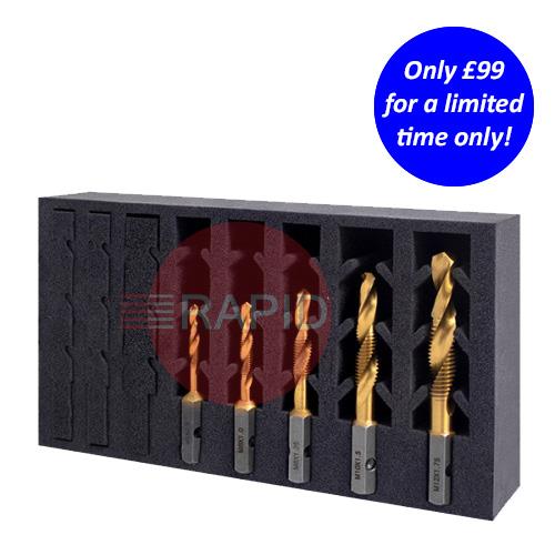 Ground Flute Twist Drill Creates the perfect Tapping Hole. Safer Tapping with Minimal Kickback; specially hardened for impact wrench use. High-grade tool Steel with ground flutes for high accuracy & long life. GoldMax low friction Titanium Coating to stop heat burnout. High Strength, Non-slip shank design.