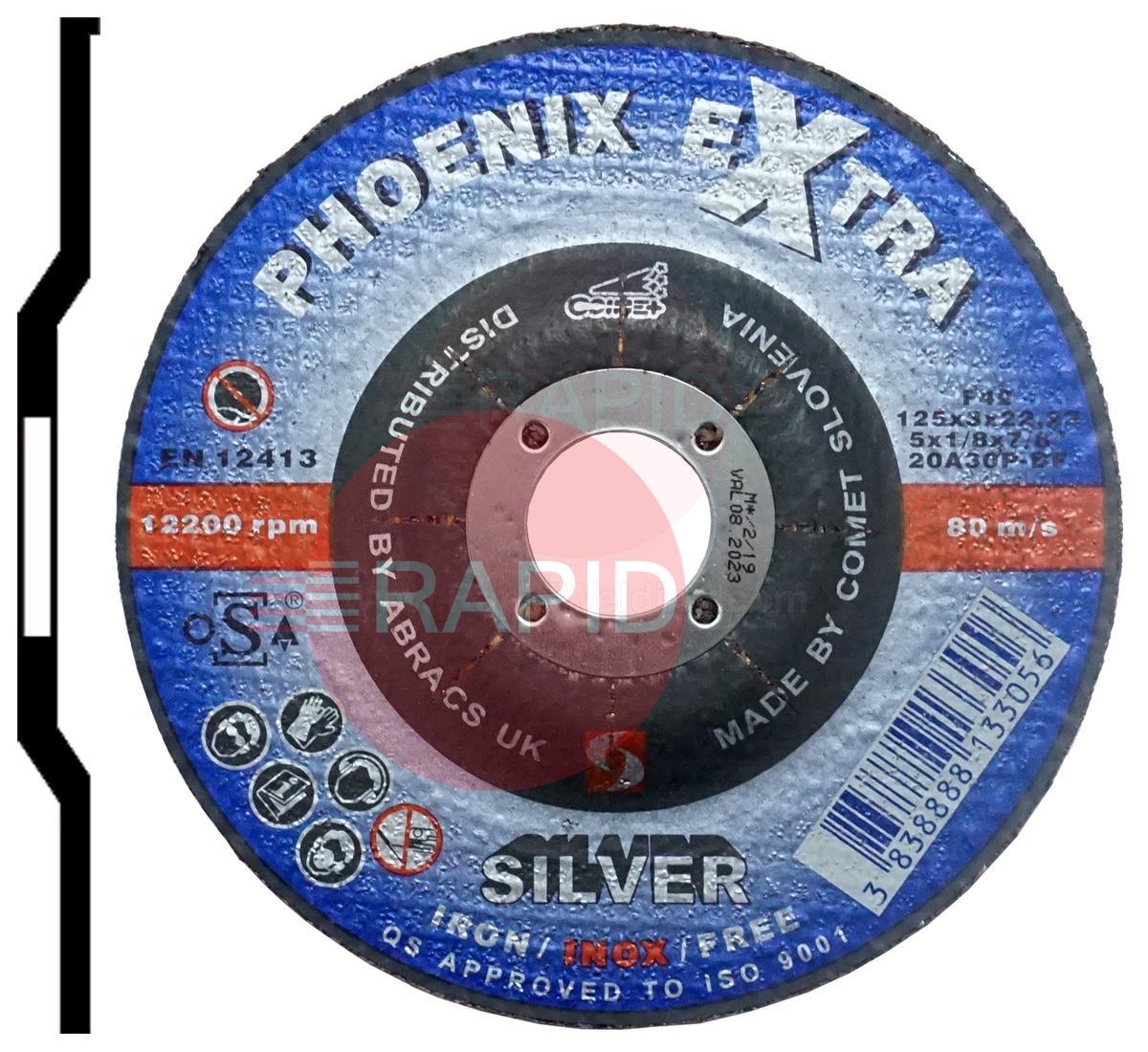 Abracs Phoenix Silver 125mm (5") Depressed Centre Cutting Disc 3mm Thick. Grade 20A24R Inox-BF for Steel & Stainless Steel.