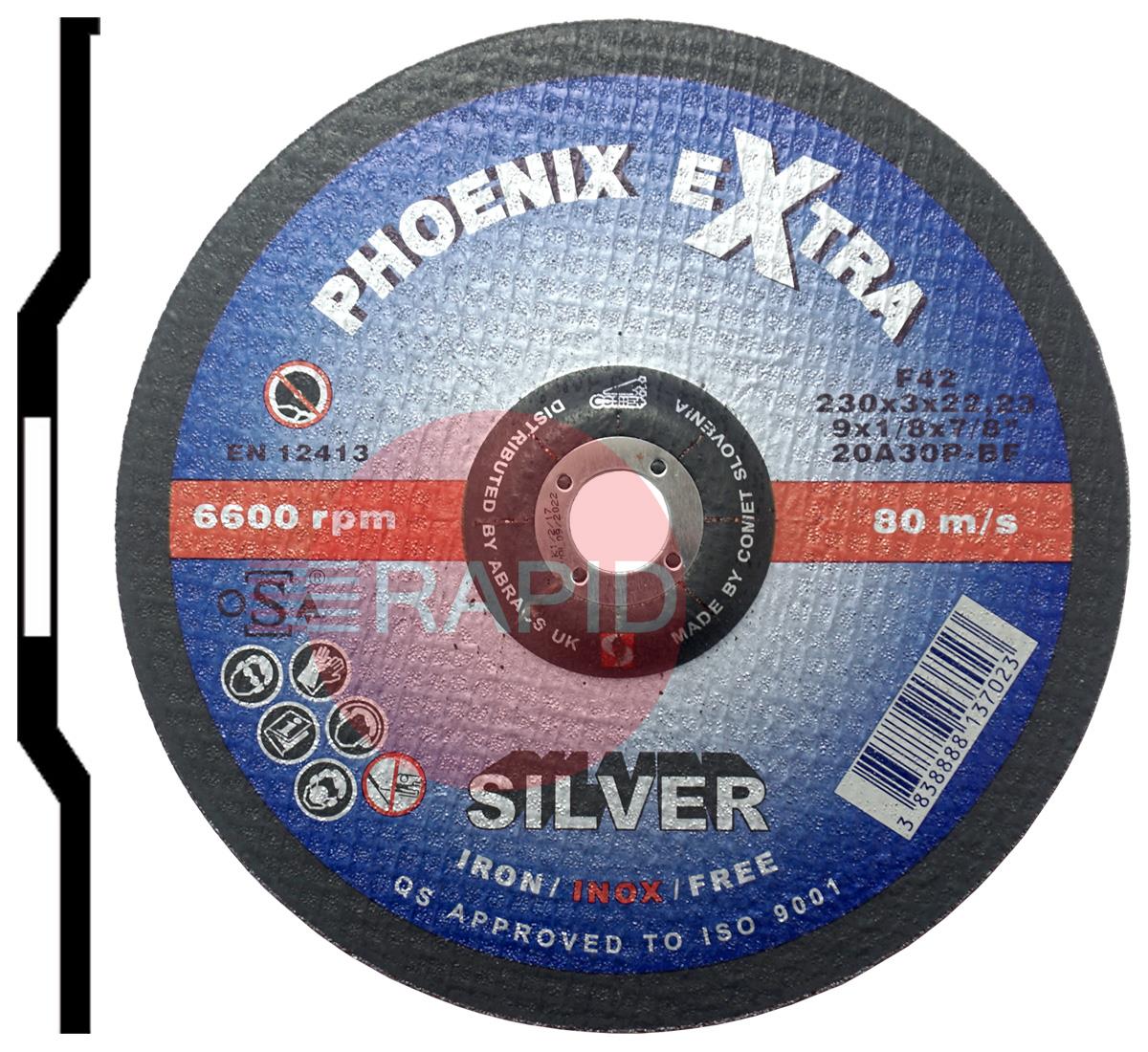 Abracs Phoenix Silver 230mm (9") Depressed Centre Cutting Disc 3mm Thick. Grade 20A30P Inox-BF for Steel & Stainless Steel.