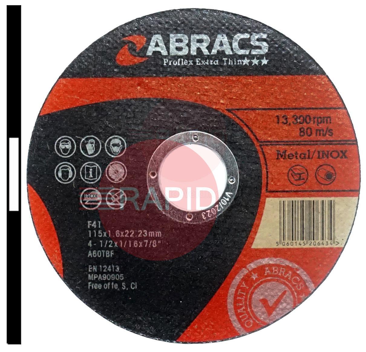 Abracs Proflex 115mm (4.5") Slitting Cutting Disc 1.6mm Thick. Grade A60T Inox-BF for Steel & Stainless Steel.