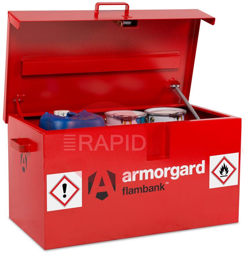 Flambank Hazardous Storage Box 980 x 540 x 475. Fully complies with all regulations for the safe storage of chemicals and flammables. Popular for external fixed applications where security is also an issue. Fully welded and tested sump base to prevent leakage. Ultra-robust 5-lever deadlocks with anti-drill plates on both sides and anti-cut rollers in the deadbolt. Robust chubb style keys supplied. High and low-level ventilation to prevent the build-up of fumes. Flame arrester gauze fitted on all boxes. Finished in bright red with relevant hazard warning signs fitted as standard. Built to specification for ½ hour fire rating.