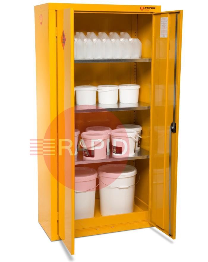 Safestor Hazardous Floor Cupboard 900mm x 465mm x 1800mm, designed to be used internally for the safe storage of flammables and chemicals, such as paint and other hazardous substances as defined by COSHH guidelines.