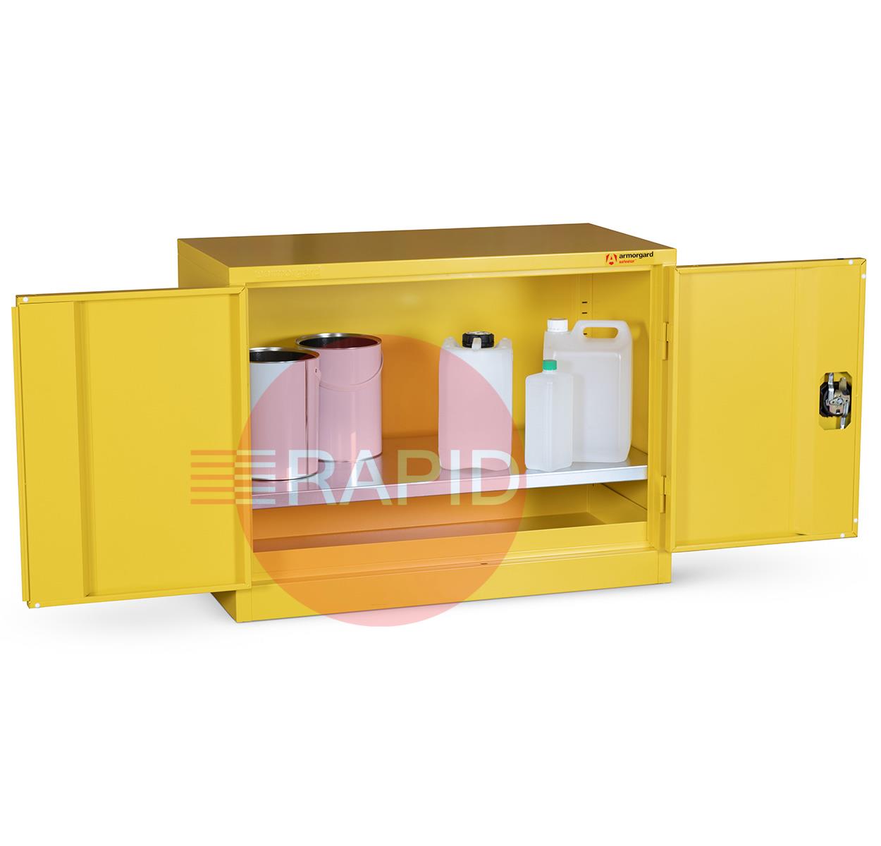 Safestor Hazardous floor cupboard 900mm x 480mm x 700mm, designed to be used internally for the safe storage of flammables and chemicals, such as paint and other hazardous substances as defined by COSHH guidelines.