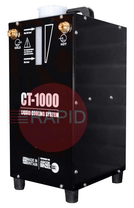 Abicor Binzel’s CT-1000 liquid cooling system is a British-made quality machine, designed to offer a long trouble-free life, and is intended for industrial applications only. This system is designed for cooling welding torches for MIG, TIG, and PLASMA, smaller resistance welding machines and similar applications. The CT-1000 unit is fitted with a long-lasting quality rotary pump with a fan. The fan provides airflow through a heat exchanger to cool the fluid. The cooler is fitted with a water tank with an inspection window on the side panel. Recommended applications are MIG to 500A/600A, TIG to 500A / resistance welding up to 60KVA. The cooler is equipped with an on/off switch to stop the pump and fan. A built-in stall protection circuit shuts down the supply to the pump motor/fan in the event of pump locking up, this prevents the motor from burning out & ensures compliance with the latest European standards.