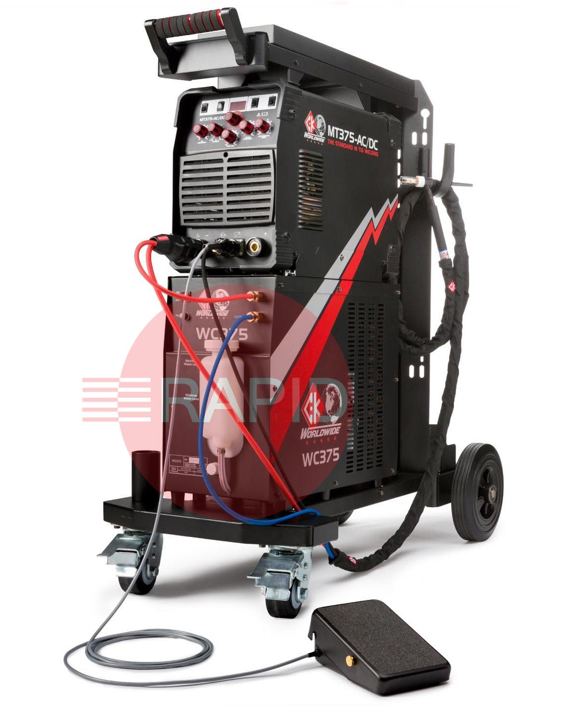 The new MT375 AC/DC Inverter Tig Welder from CK Worldwide, with dual pump water cooler, TrimLine tig torch and cart. This 375A inverter features AC balance and frequency, post gas flow settings, and pulse settings that use analog dials. Fully equipped for all those big jobs, including the new CK Steady-Grip Foot Pedal.