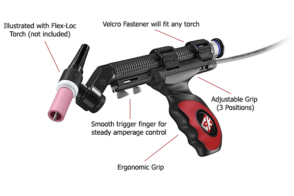With a removable and adjustable pistol grip style handle, the new CK Steady Grip gives the operator smooth, accurate and ergonomic trigger finger control of the TIG welding process. The Steady Grip can be used with most constant current TIG power sources and provides machine contactor on-off, gas solenoid activation and full range amperage control.