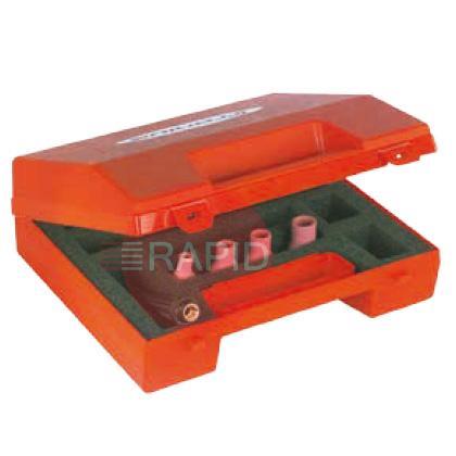 Kit contains 2 tungsten electrodes, 3 gas nozzles 2 clamping sleeves, 2 clamping nuts, and 1 torch cap long.
