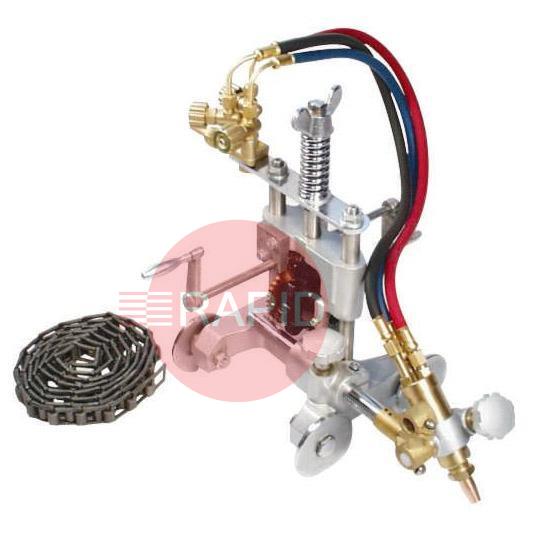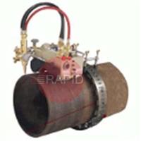 A manual chain-driven pipe-cutting machine that provides smooth, accurate cutting action by incorporating a low gear ratio and worm wheel drive. Cuts 5-50mm thick wall on pipe with 114-600mm (4-24) diameter. The scale on a rack and pinion can set the bevelling head angle quickly and accurately. This complete package is supplied with a 2.4m length of guide chain and a selection of ANM cutting nozzles. Solidly constructed using brass, chromed and stainless steel parts.