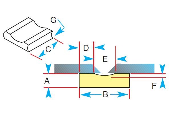 This tile is larger and has a larger groove than the 1G42 tile or the 1G41-R tile where the user needs more penetration and more substance in the tile. Possibly for submerged arc welding applications and thicker plates. Each tile is radiused to form a strip around the cylinder.