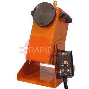 The weld positioner's rotation speed is electronically controlled using an optical tachometer located on the back of the gear motor. Speeds within the range of the model are infinitely variable in both clockwise and counter-clockwise directions through a rotary speed adjustment potentiometer located on the remote control. Table tilt is manually set at any desired angle, from 0° through 90°, quickly and easily. Safety while using the positioner is greatly enhanced with Gullco’s low voltage (24 V) control and power supply system.