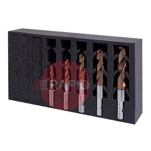 Twist drill set featuring extended life bits with a specialist Titanium Nitride coating that helps protect and reduce friction.