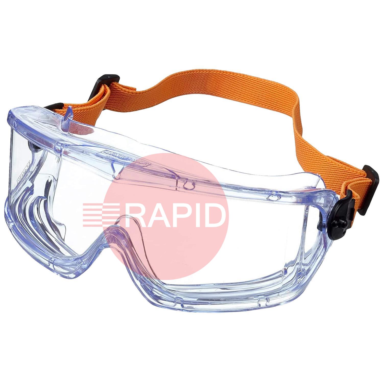 Honeywell presents the V-Maxx Safety Goggles, which contains a sporty style structure designed for an increased wearer acceptance of the 180° field of vision for a preferred distortion free peripheral vision. This is advanced by a specialised concept of indirect ventilation and is compliant with splash-resistance. This model fits a mass variety of workers in a range of different industries. These can be worn over prescription eye wear and with half-mask respirators. The rotating strap attachments do provide easier usage with hard hats.