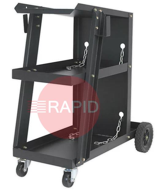 A black, electrostatically-painted, robust and solidly-constructed mobile workshop organiser trolley, designed to carry your welding equipment & accessories. Will transport Arc and MIG welders, inverters and some plasma cutter power sources. Supports larger industrial gas bottles and will carry hoses, torches, tools and consumables on the 2 included shelves. This trolley also incorporates heavy duty castors - 2 fixed and 2 swivel. Base Size 294 x 695mm. Overall height (excluding handle) 610mm. Supplied flat packed for self assembly.
