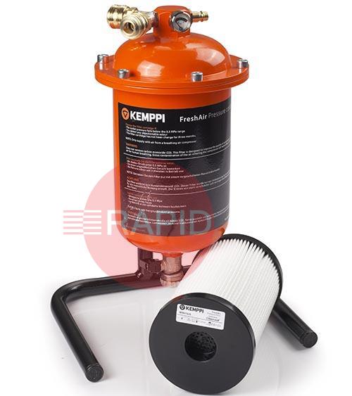 FreshAir PRESSURE Conditioner is an in-line filter station designed for improving the quality of supplied air. The strong metal pressure container incorporates a high capacity combined filter. The FreshAir PRESSURE conditioner removes particles and unpleasant odours from airline supply systems, substantially improving the quality of the breathing air. The quick couplings allow single-handed assembly of the device and the outlet connection is prepared for two operators. A standard pressure gauge measures the outlet pressure.