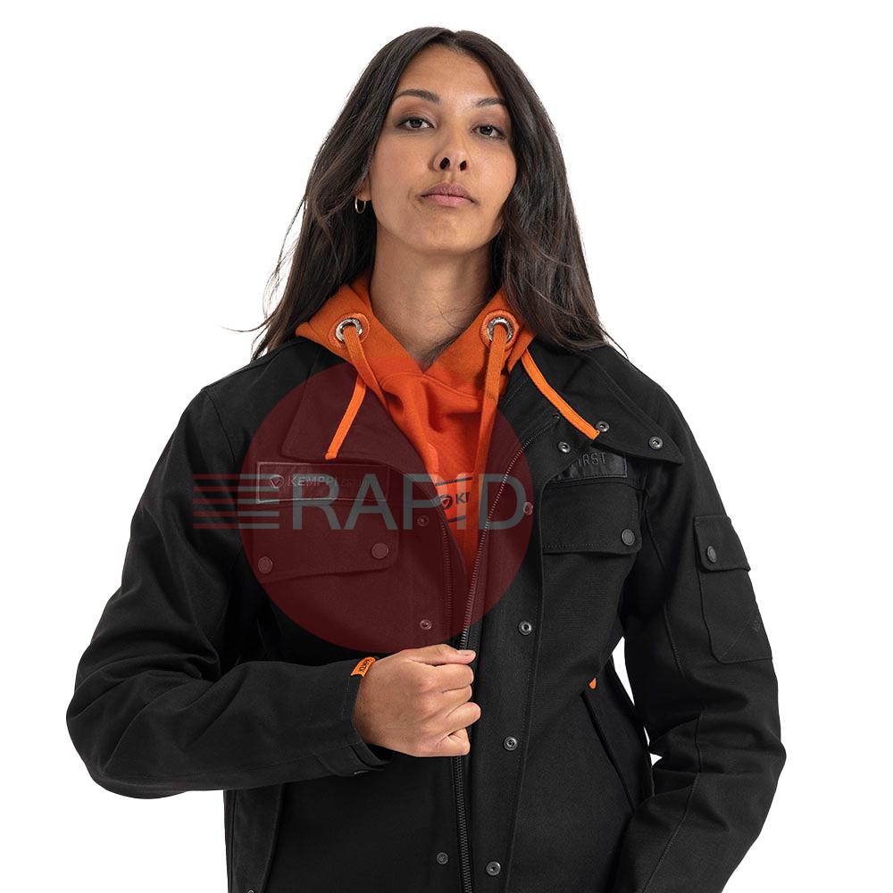 Kemppi Wear model 0013. A timeless premium jacket. Inspired by iconic streetwear and the demanding world of welding. Designed to fit both male and female. Made from canvas woven material. Front buttons are covered so as not to transfer heat from outside to inside. Chest and side pockets to carry your essentials. Made from flame retardant fabric of 55% modacrylic, 33% cotton, 10% polyamide and 2% antistat. Black with orange detailing and Navy blue with orange detailing. Not certified to welding standards.
