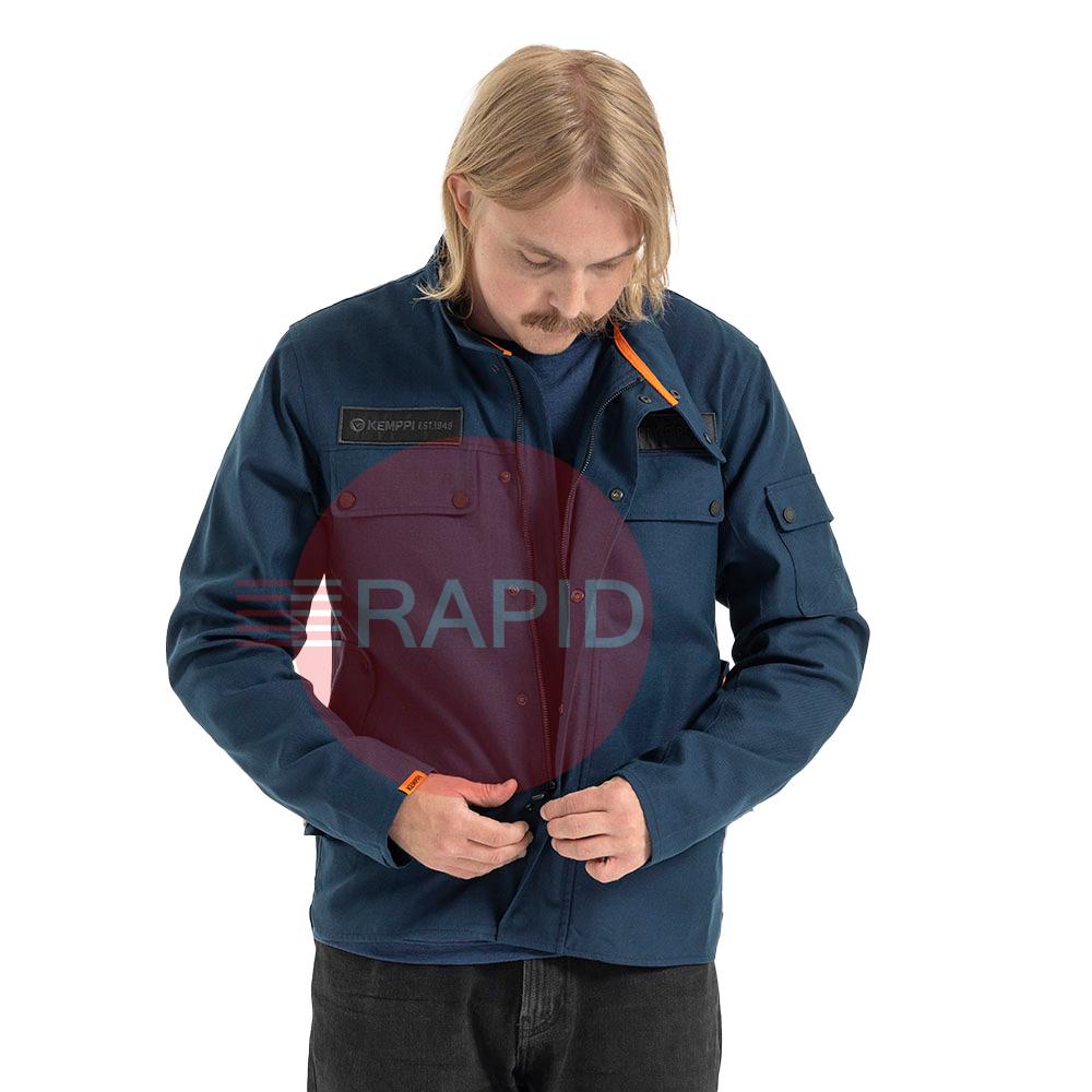 Kemppi Wear model 0013. A timeless premium jacket. Inspired by iconic streetwear and the demanding world of welding. Designed to fit both male and female. Made from canvas woven material. Front buttons are covered so as not to transfer heat from outside to inside. Chest and side pockets to carry your essentials. Made from flame retardant fabric of 55% modacrylic, 33% cotton, 10% polyamide and 2% antistat. Black with orange detailing and Navy blue with orange detailing. Not certified to welding standards.