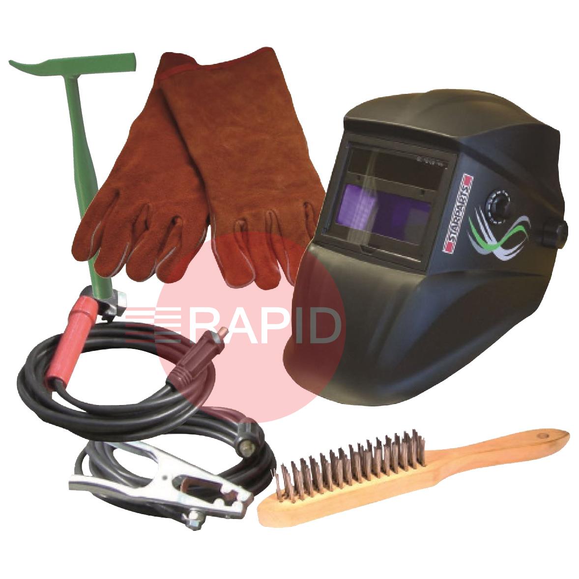 This site-ready package includes the ArcStar GW5-200 machine, a wheel kit, a welding lead set, a light reactive welding helmet, welding gauntlets, a chipping hammer and a wire brush.