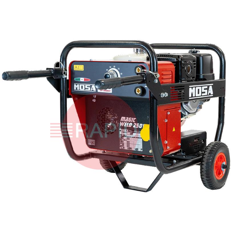 This site-ready package includes the MagicWeld 250 generator, 5m welding lead set, auto darkening welding helmet, pair of welding gauntlets, chipping hammer and wire brush.