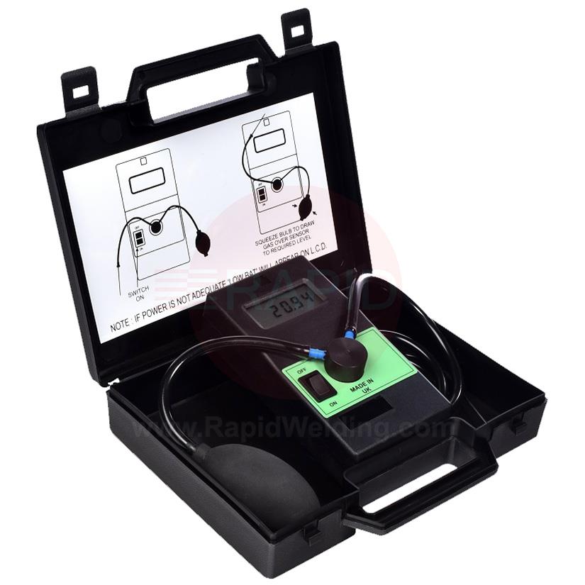 The package includes an oxygen monitor, a hose, a flow adaptor, stainless steel probe, an aspirator bulb, a carry case and operating instructions.