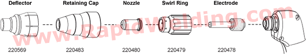 TORCH CONSUMABLES FOR HYPERTHERM POWERMAX 30 - ALL ITEMS ARE PRICED PER INDIVIDUAL ITEMS. (NOT PER PACK) Click the item number in the in the diagram to be taken to the part