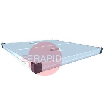 The integrated suspension eyes enable ceiling mounting/hanging of the hood. Legs are also available for floor mounting. This Double compartment package consists of 2 rows of roof plates with 2 cross-mounted main frame profiles in between. The modular extraction hood can optionally be provided with welding strips (recommended), legs and a lighting fixture.