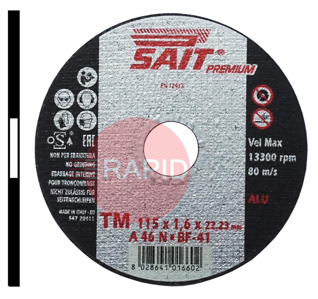SAIT Premium 115mm (4.5") Slitting Cutting Disc 1.6mm Thick - Grade TM A 46 N For Aluminium.