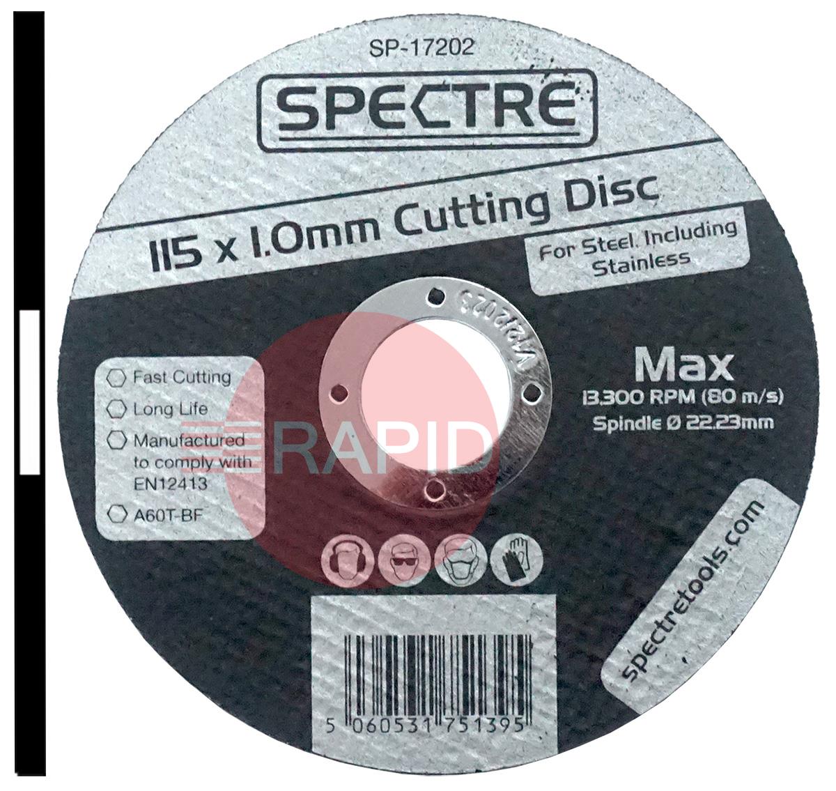 Spectre 115mm (4.5") Slitting Cutting Disc 1mm Thick. Grade A60T-BF for Steel & Stainless Steel.