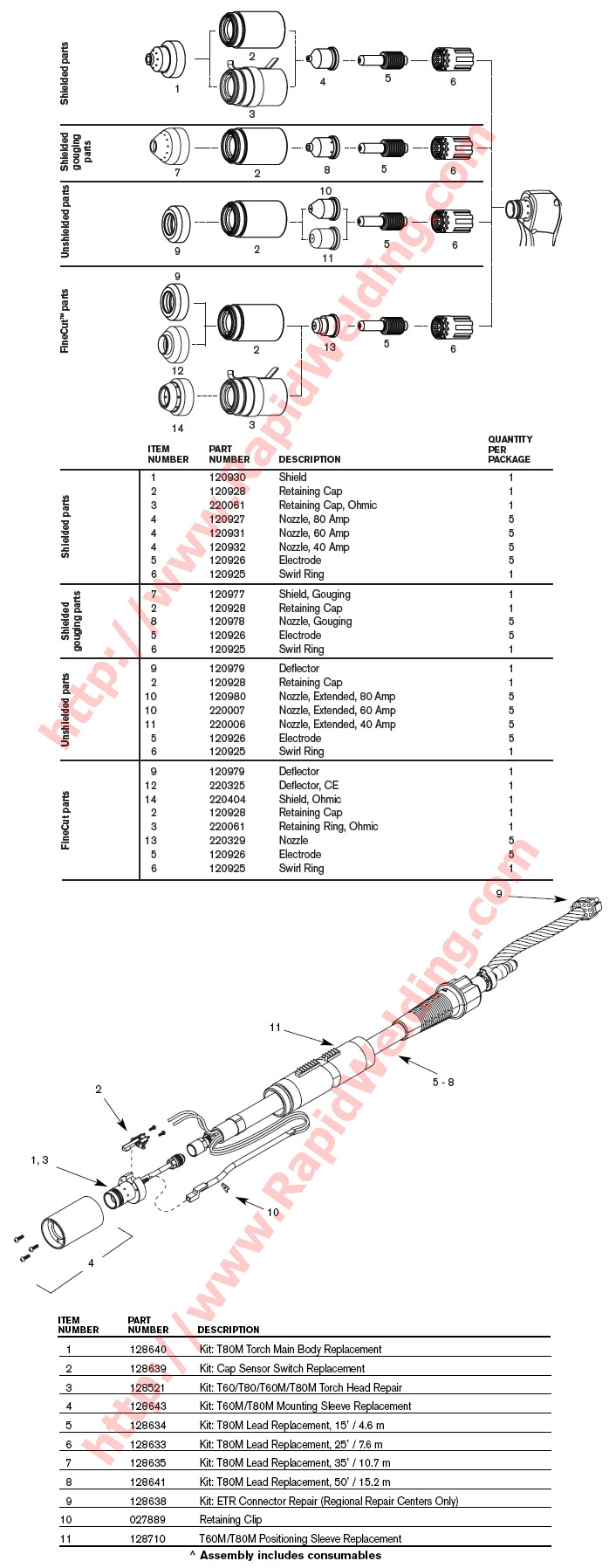 Below the breakdown of the front end consumables for this torch, you'll find a breakdown of the torch head assembly.