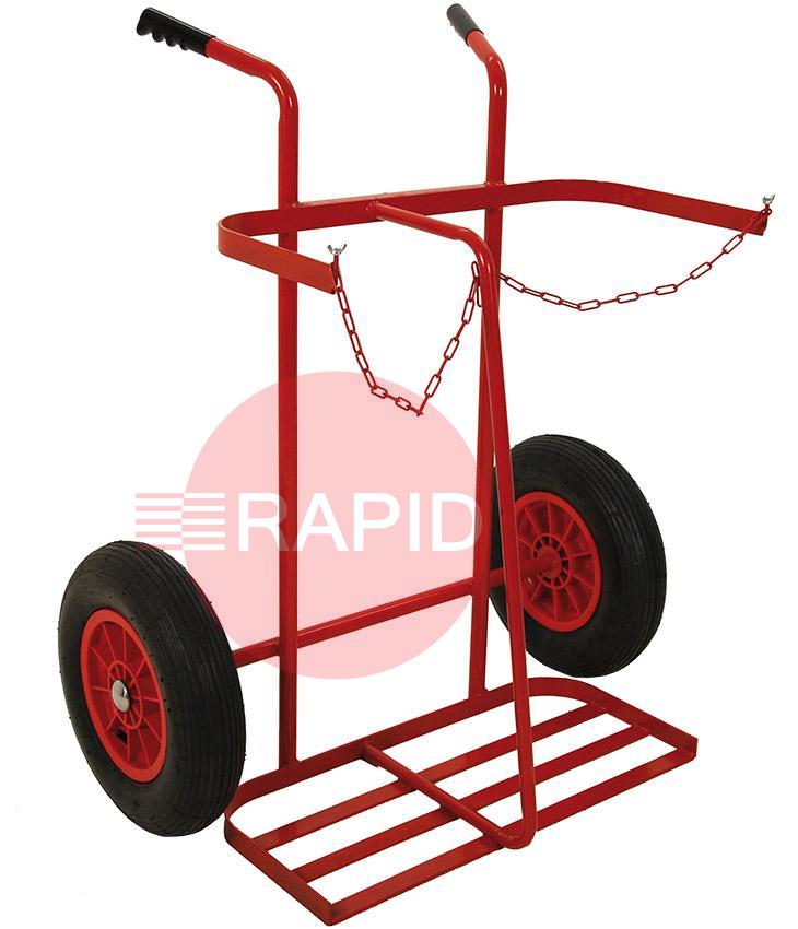 Twin Oxy Propane Cylinder Trolley with pneumatic wheels for uneven terrain.