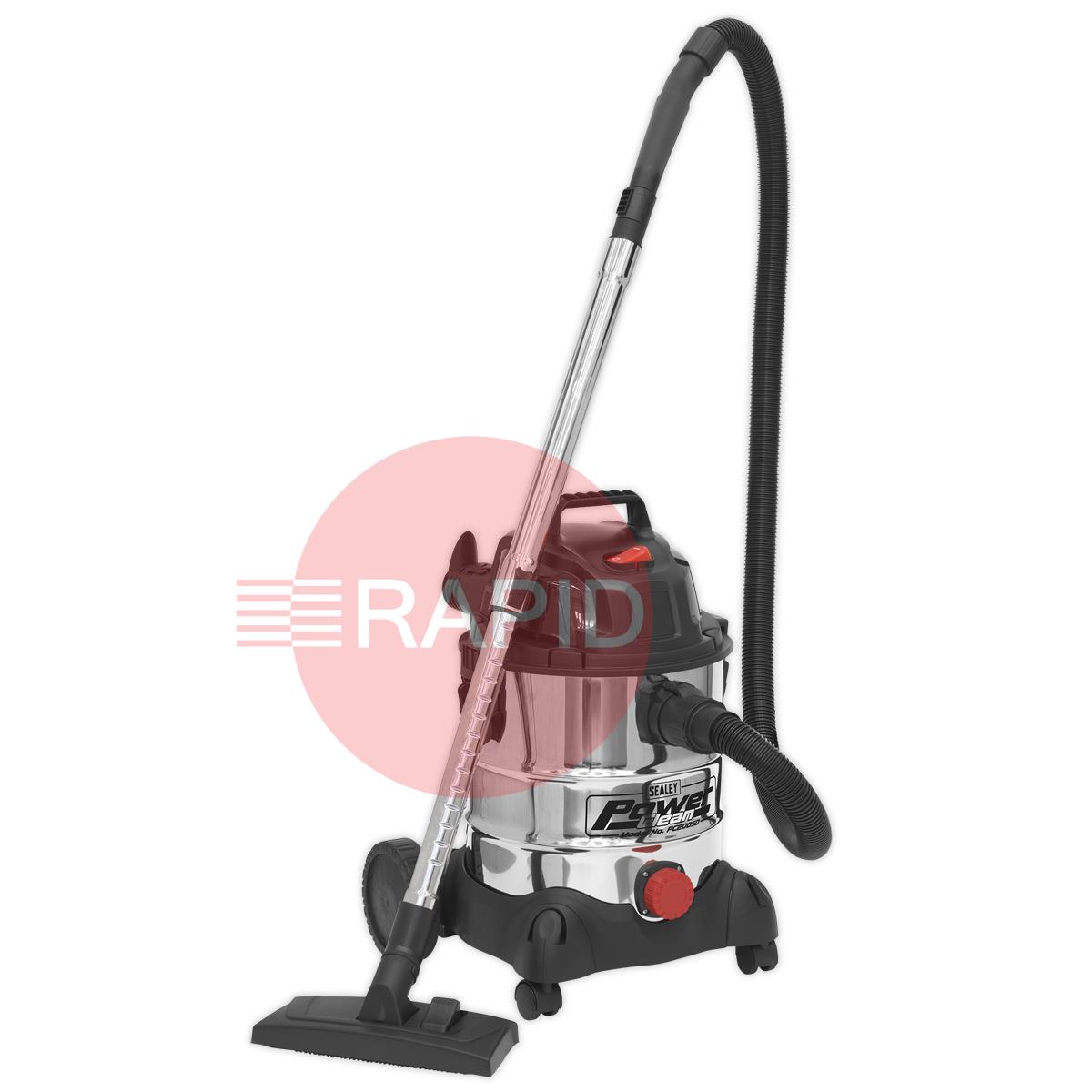 High powered, lightweight industrial unit with blower facility. Constructed from stainless steel, the drum unit is mounted on two castor and two fixed wheels. Tool storage points on head and base. Supplied with 4mtr cable and plug, deluxe tool kit, including stainless steel telescopic rigid extension tubes, cartridge filter and wet-use foam filter.