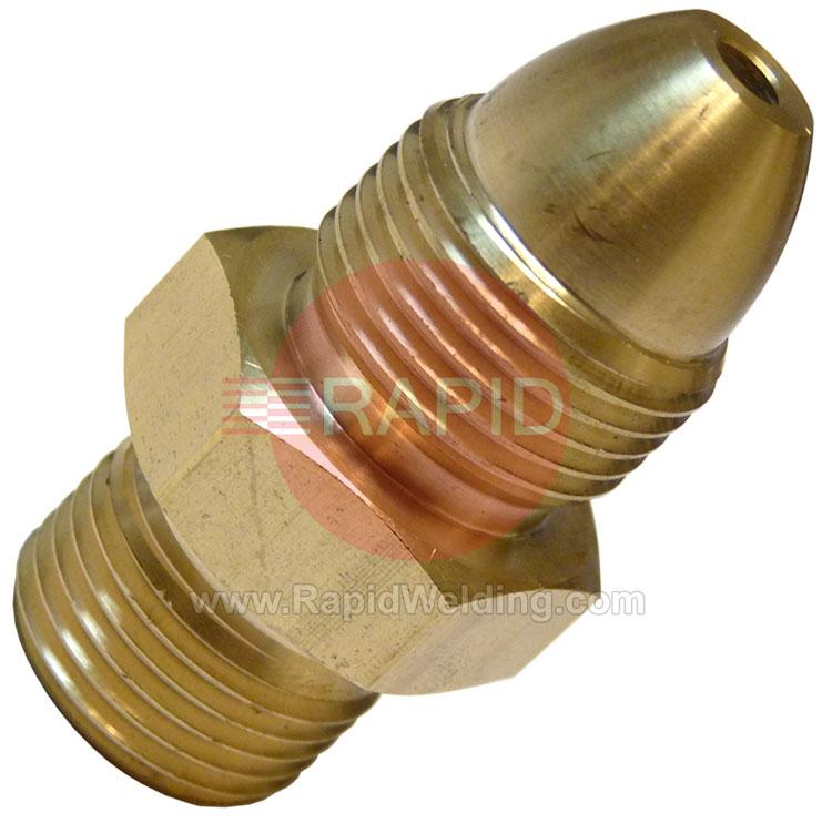 The CO2 to Argon Adaptor is used to connect a CO2 regulator to an Argon cylinder outlet. The double-threaded brass adaptor has a CO2 bottle fitting at the top, which connects to the nut on the regulator inlet, and a 5/8 BSP right-hand threaded fitting at the bottom, which screws in to an Argon bottle.