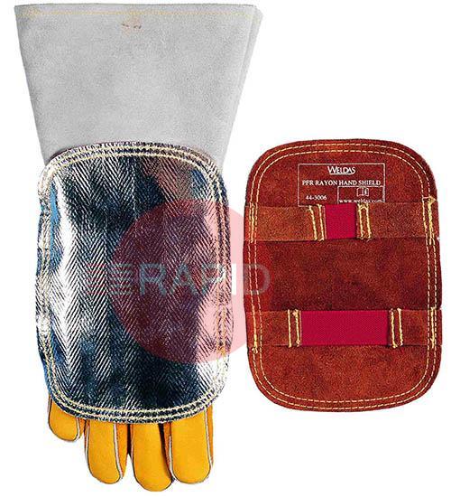 Heat-reflective Aluminised handshield, for use in areas of high heat. Split cowhide leather and sewn KEVLAR thread, 15cm x 20cm.