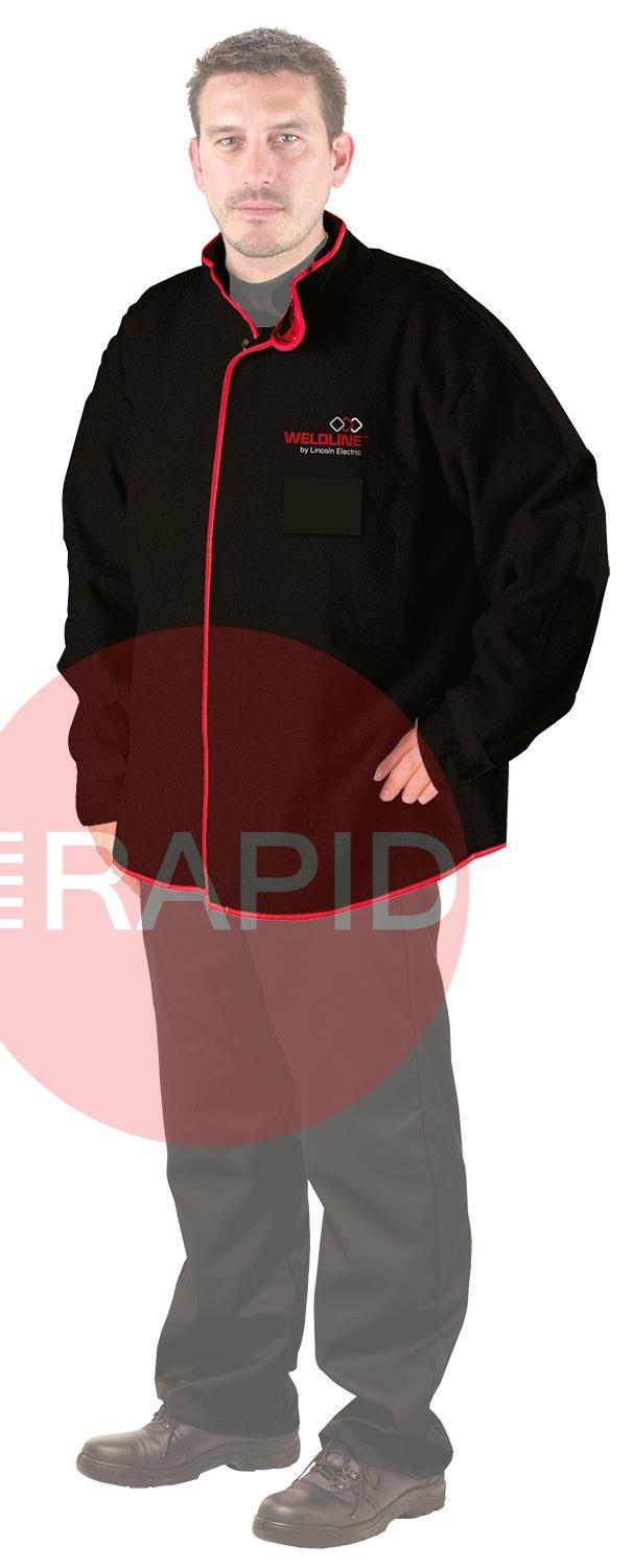 The Split Leather Welding Jacket is designed to protect the upper body of the wearer from welding spatters and grinding particles. The leather jacket is a comfortable fit, fastened with snap buttons, pockets inside, tightening elastic at the wrist and finished with a red trim. This jacket fastens in the front with an overlap of leather and Velcro for added protection against spatters. The inner neck of the jacket is made of double cotton to provide maximum comfort to the user. Dimensions 780mm +/-.
