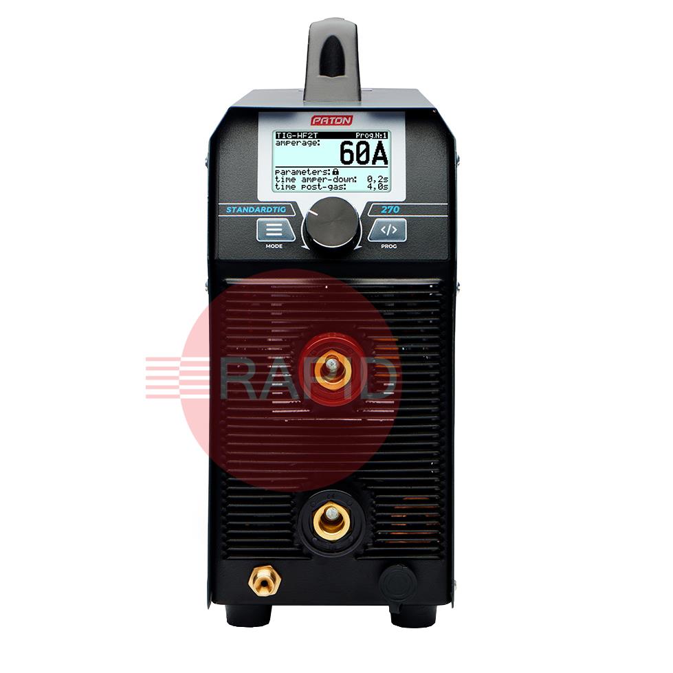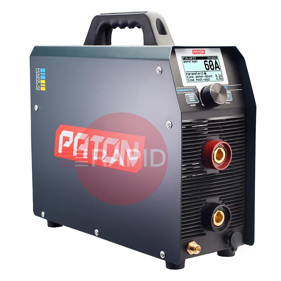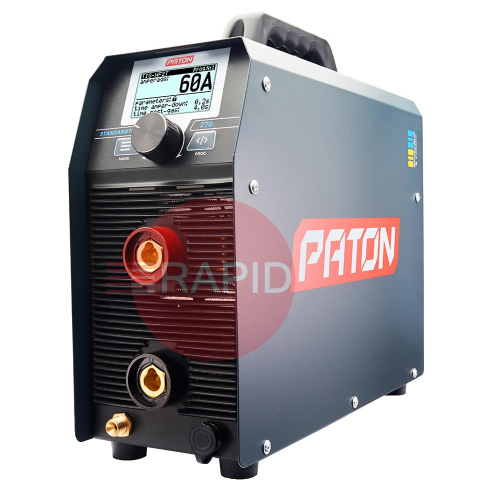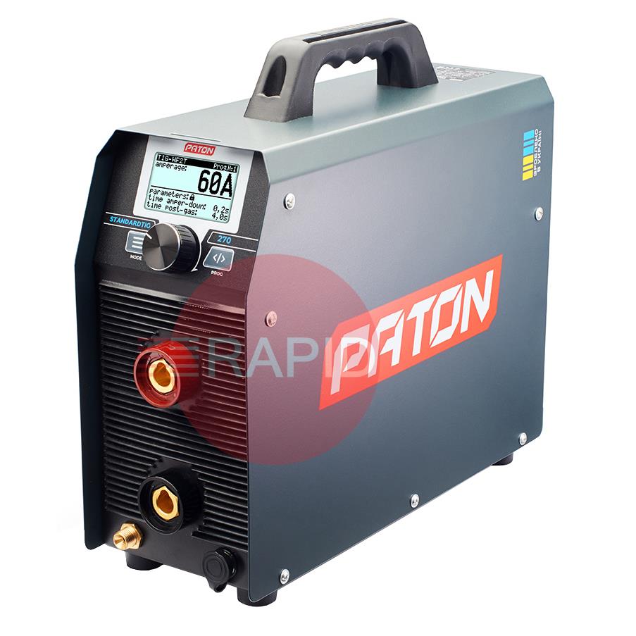 PATON StandardTIG 270 digital inverter welder is optimised for TIG (HF) inert gas shielded arc welding, manual submerged electrode arc welding (MMA) and semi-automatic MIG/MAG arc welding (as a source with external feeder) with direct current. Each of the methods mentioned above allows us to use pulsed current (PULSE function). The StandardTIG 270 features a 70% duty cycle and a 3-year warranty.
