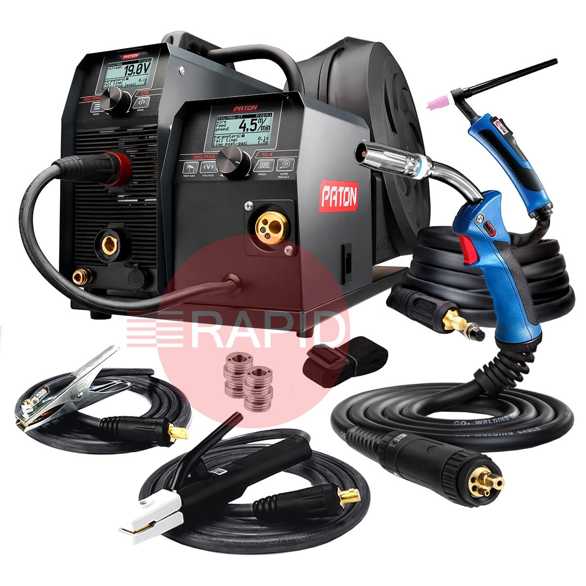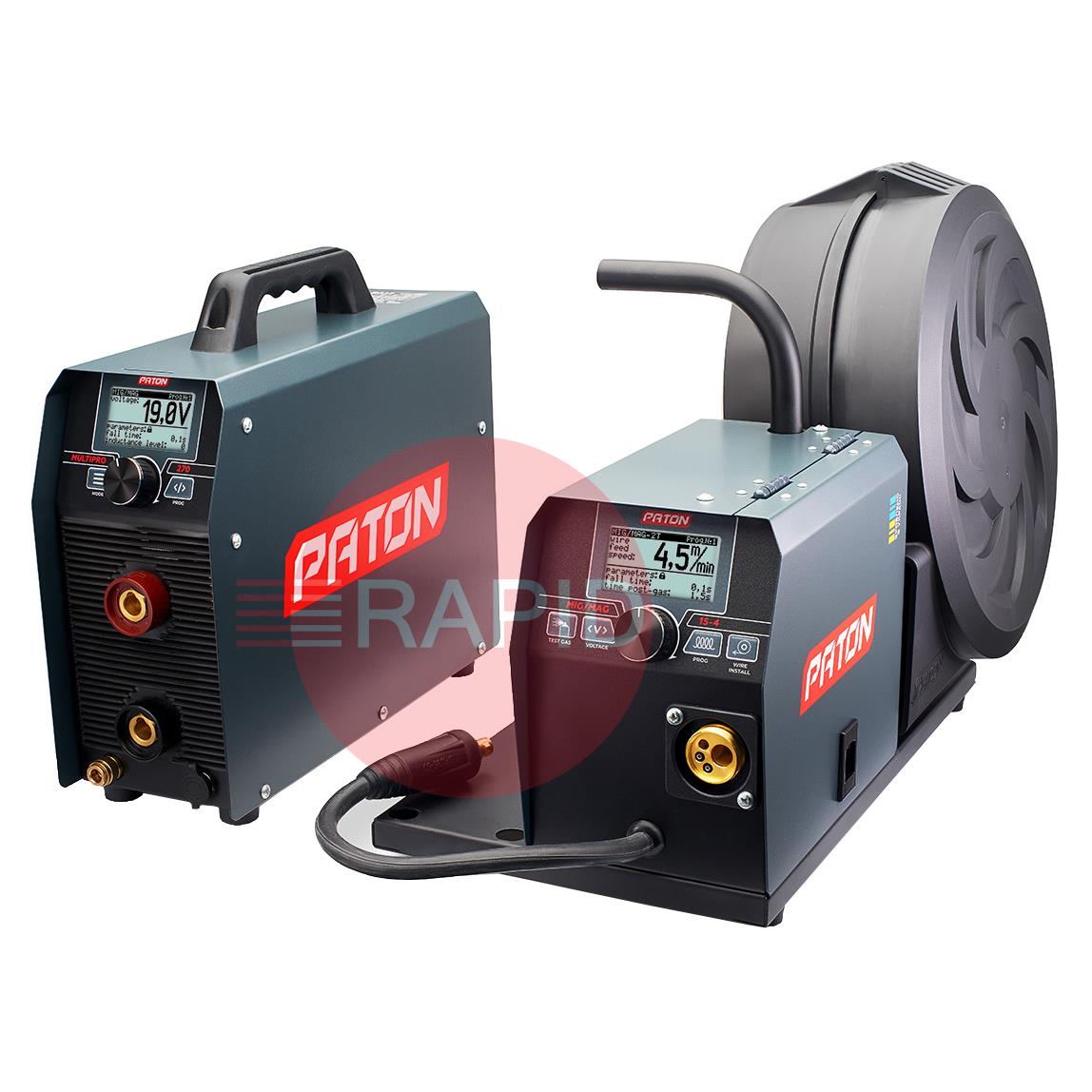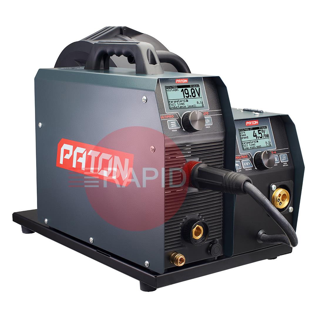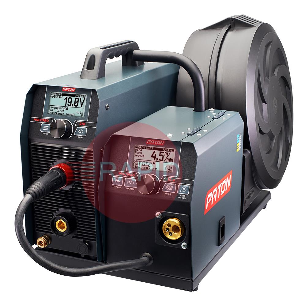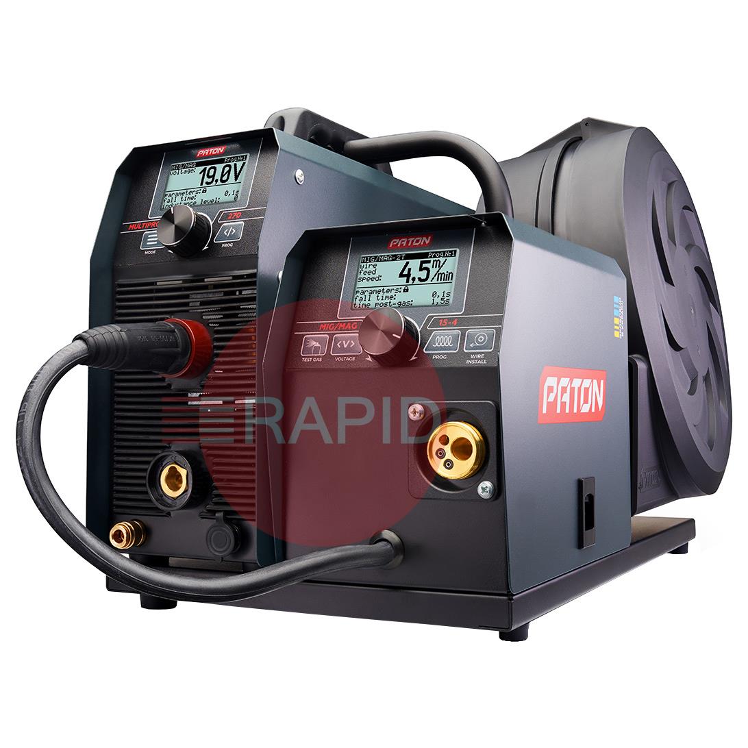 The digital multifunctional welder inverter, PATON MultiPRO 270 15-4 400V, is intended for semi-automatic welding with the MIG/MAG method, manual arc welding with the MMA method, and arc welding with the TIG HF method in a shield of gases and protective mixtures with direct current. These machines operate from a 400V single-phase power supply and have an IP33 protection class.