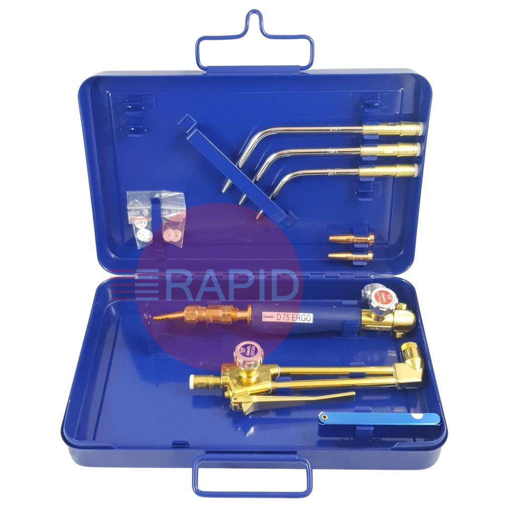 The D75 ERGO works according to the injector principle, which means that oxygen is sucked into the torch with fuel gas (acetylene). The advantage is that it is very easy to set the mixing ratio between the gases. The main component of the D75 is the handle. The D75 ERGO combines good design with good grip and controllability for the welder.