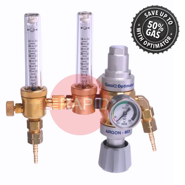 GasiQ Optimator II Argon/H2 Mix Gas Saver Regulator. 34Lpm. W21.8 x 1/14"L Cylinder Connection. G3/8"L Outlets.