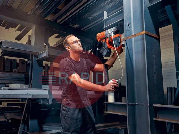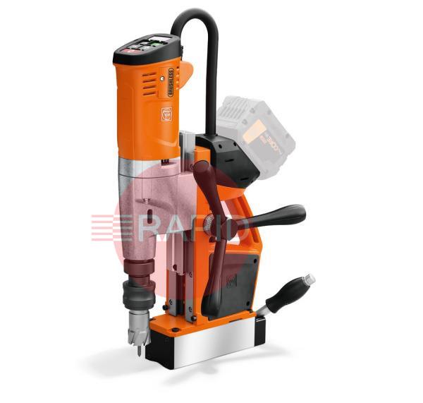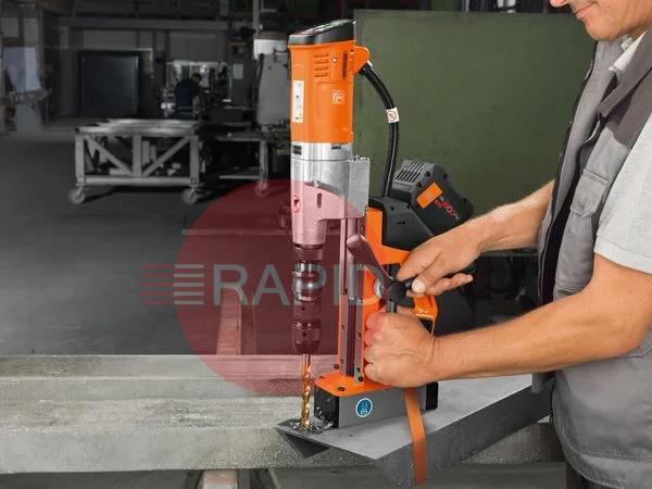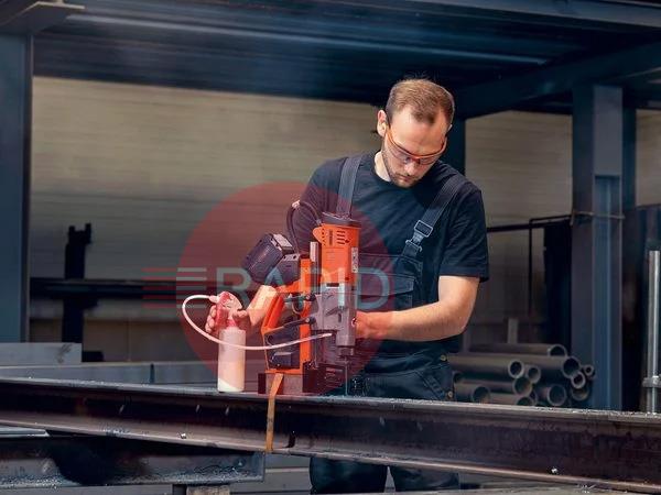 1 cordless magnetic core drill, 1 coolant pump, 1 lashing strap, 1 swarf hook, 1 centring pin 100mm, 1 contact guard, 1 drift key and 1 case.